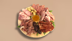 Μορταδέλα, προσούτο crudo, προσούτο cotto, σαλάμι Milano, Spianata, ελιές ,κρουτόν, σως